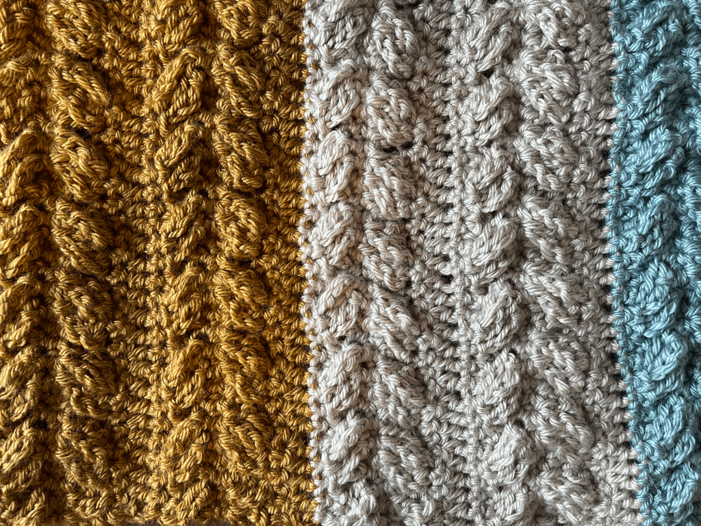 I’ve tried different techniques to get more texture into my crochet work—stitching into the back loop, bubble stitches, various combinations of sc, dc and half dc to mix it up. Cables were really intimidating. Well, not anymore…they are fantastic. I used this “Alpine Cable Blanket” pattern by hollanddesigns on Etsy. I misread the pattern on the first go (the cables are supposed to mirror each other.) But started to get into the groove, literally, on the second project. As a side note, I am obsessed these days with creating color blocks as a design element.